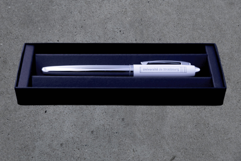 Dans le cadre de ses engagements en matière de développement durable et responsabilité sociétale, l'Université de Strasbourg a fait le choix de limiter sa boutique à 4 objets, liés directement à ses activités de recherche et de formation, à savoir : le bloc-notes, le stylo, le carnet et le tour de cou.