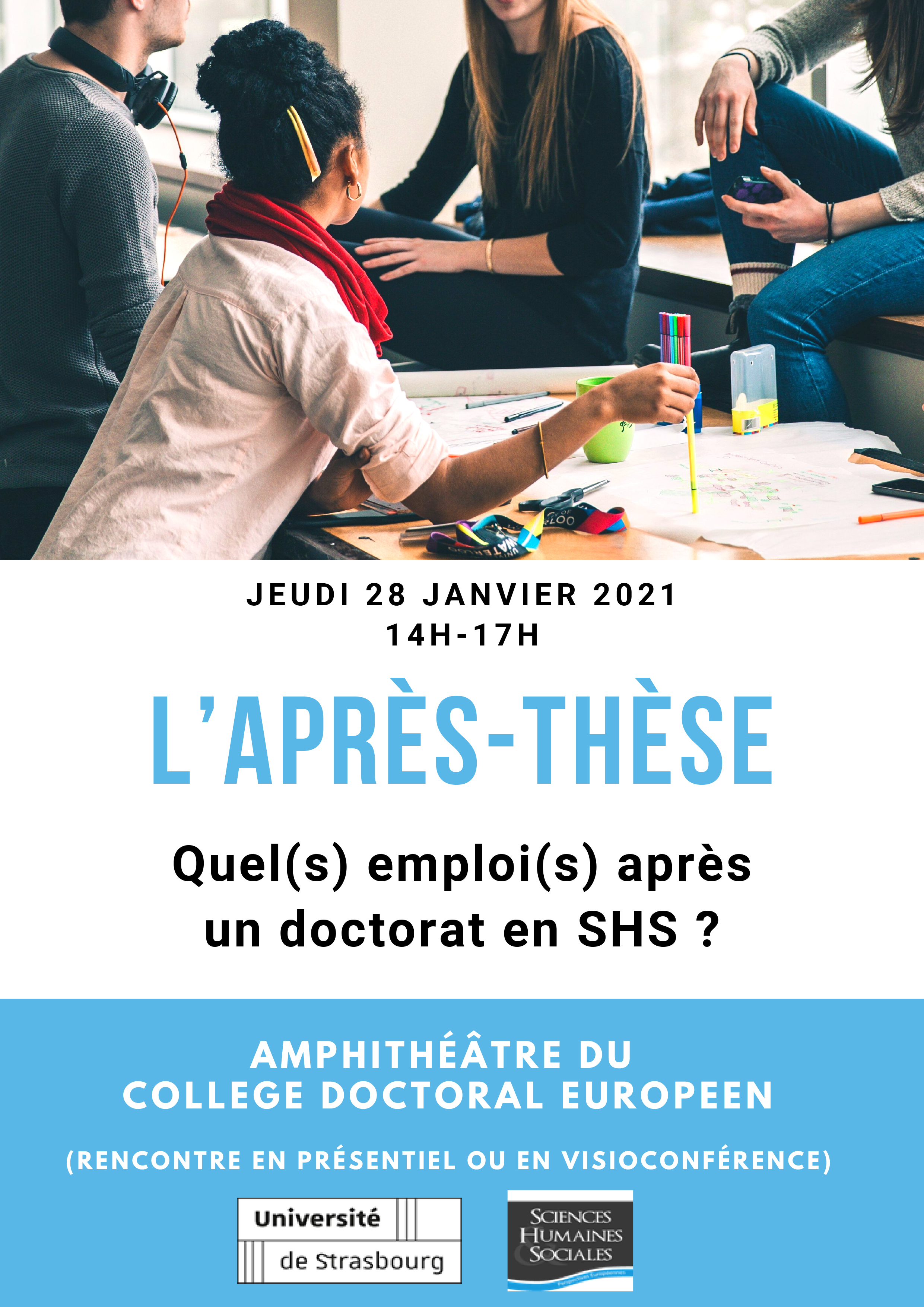 Une rencontre intitulée "L’après-thèse - Quel(s) emploi(s) après un doctorat en SHS ?" aura lieu le vendredi 28 janvier à 14h en ligne.