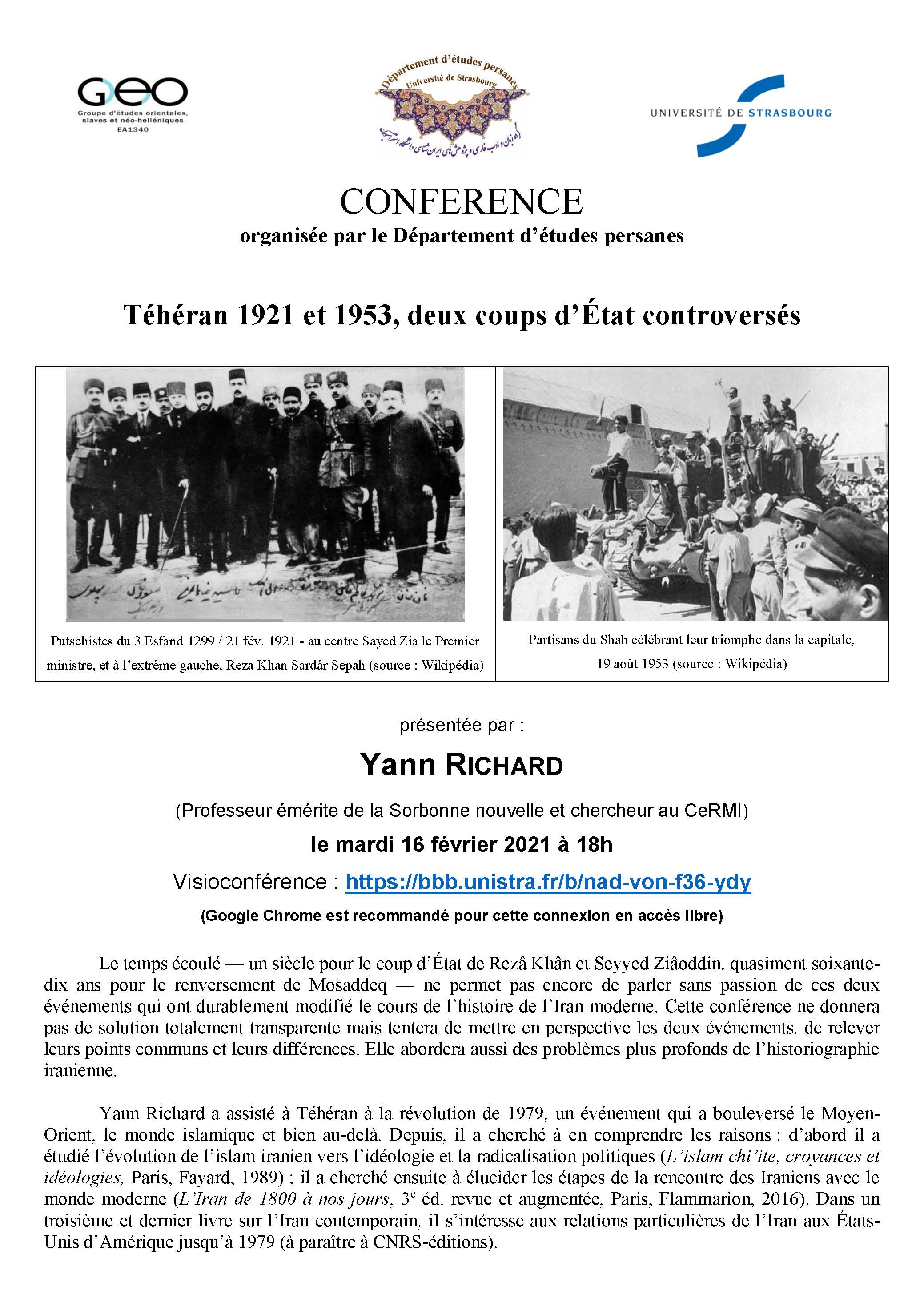 Le Département d'études persanes de l'Université de Strasbourg est heureux d’accueillir Yann RICHARD, Professeur émérite de la Sorbonne nouvelle et chercheur au CeRMI, pour une conférence intitulée : « Téhéran 1921 et 1953, deux coups d’État controversés ».