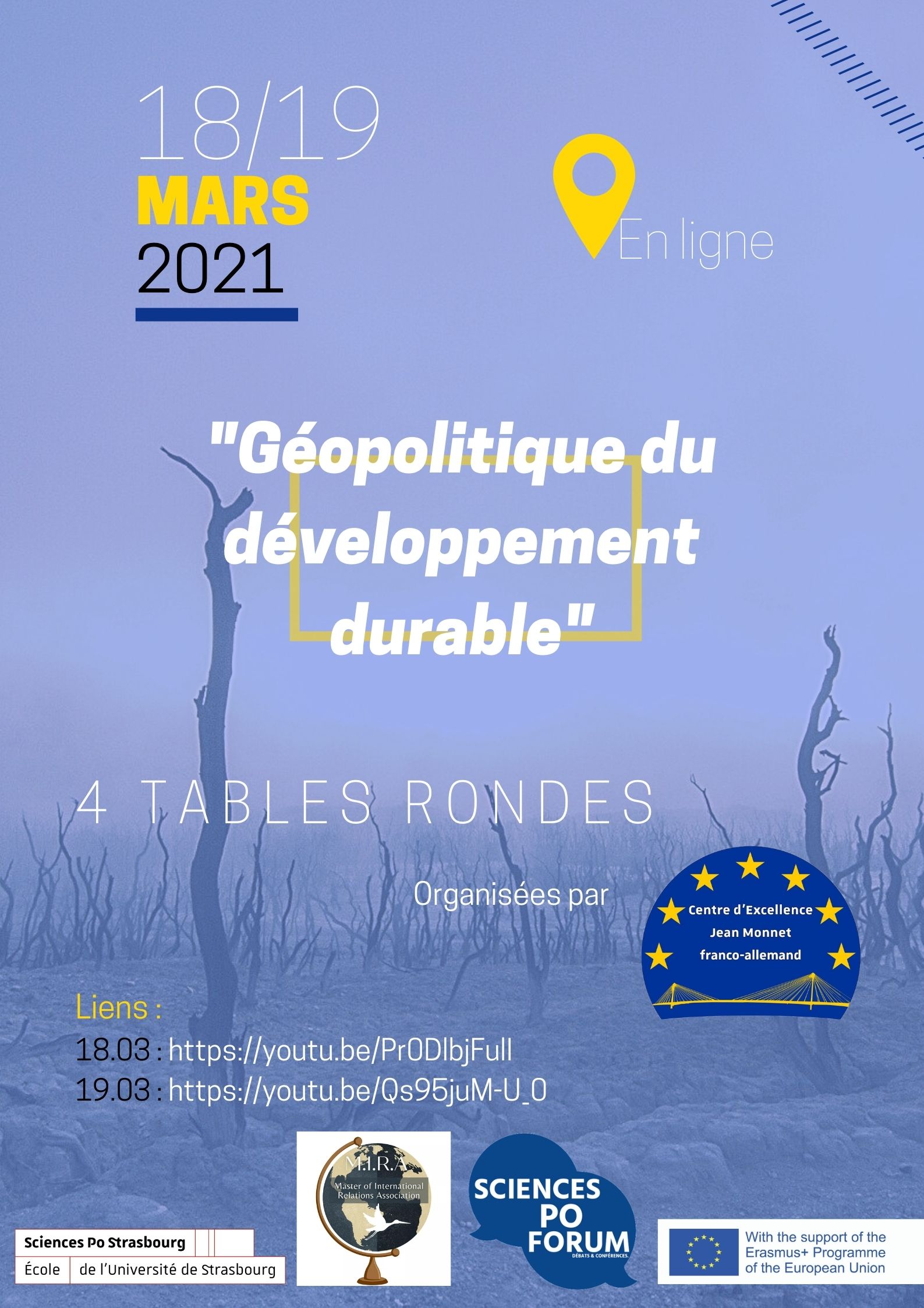 Le Centre d'excellence Jean Monnet de Sciences Po Strasbourg organisera les jeudi 18 et vendredi 19 mars 4 webinaires de 18h30 à 21h30 dans le cadre du festival de géopolitique.