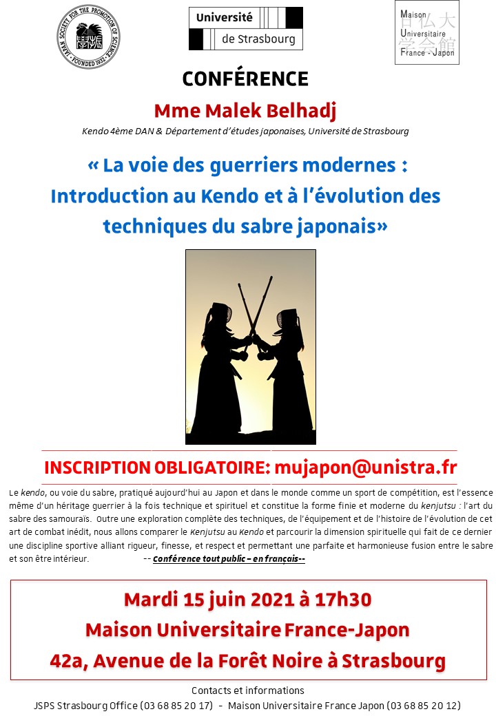 Une conférence intitulée « La voie des guerriers modernes : Introduction au Kendo et à l’évolution des techniques du sabre japonais » aura lieu le mardi 15 juin à 17h30 à la Maison Universitaire France-Japon. Elle sera animée par Mme Malek Belhadj, Kendo 4ème DAN & Département d’études japonaises, Université de Strasbourg