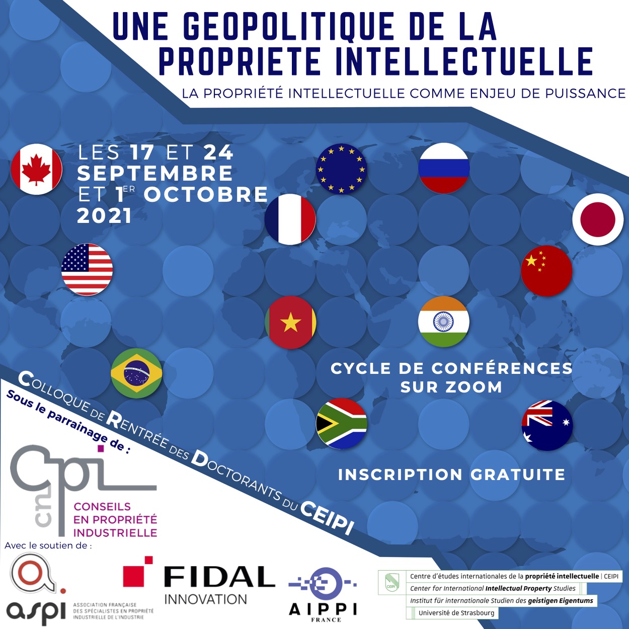 À l'occasion du cycle de conférences de rentrée du Centre d'Études Internationales de la Propriété Intellectuelle (CEIPI), une conférence intitulée « Une géopolitique de la propriété intellectuelle » aura lieu le vendredi 24 septembre à 14h au Cardo à Strasbourg.