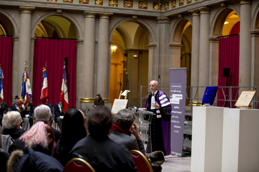 Chaque année, l’Université de Strasbourg commémore les événements qui se sont déroulés lorsqu’elle était repliée à Clermont-Ferrand. La mise en lumière de ces moments se fait dans un souci de devoir de mémoire et de droit à l’histoire et selon trois valeurs : la liberté, la vérité, la démocratie.
