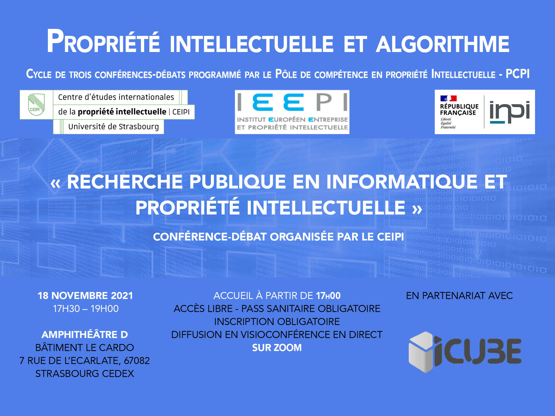 Une conférence-débat intitulée « Recherche publique en informatique et propriété intellectuelle » aura lieu le 18 novembre à 17h30 au Cardo sur le site de l'hôpital civil de Strasbourg.