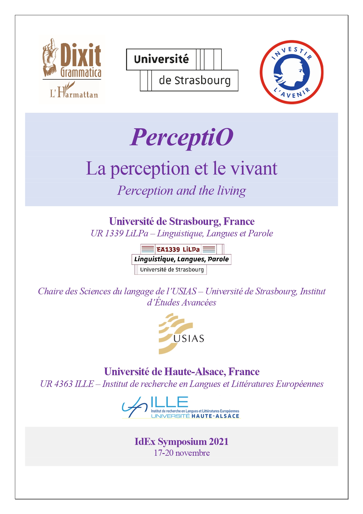 L’Université de Strasbourg (France), à travers l’UR 1339 LiLPa (Linguistique, Langues et Parole) ainsi que la Chaire des Sciences du langage de l’USIAS (Université de Strasbourg, Institut d’Études Avancées), et l’Université de Haute-Alsace (France), à travers l’UR 4363 ILLE (Institut de recherche en Langues et Littératures Européennes), accueilleront en Alsace le symposium « PerceptiO : la perception et le vivant/perception and the living » du 17 au 20 novembre 2021.