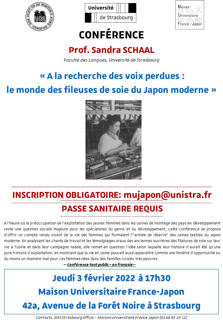 La Maison Universitaire France-Japon, en collaboration avec The Japan Society for the Promotion of Science (JSPS), a le plaisir de vous convier à la conférence intitulée « A la recherche des voix perdues : le monde des fileuses de soie du Japon moderne » qui aura lieu le jeudi 3 février à 17h30 à la Maison Universitaire France-Japon