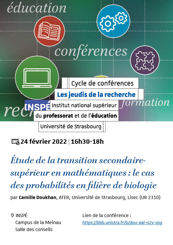 Dans le cadre du cycle de conférences - Les jeudis de la recherche, une conférence intitulée « L'étude de la transition secondaire-supérieur en mathématiques : le cas des probabilités en filière de biologie» aura lieu le jeudi 24 février à 16h30 à l'Institut national supérieur du professorat et de l'éducationà la Meinau.