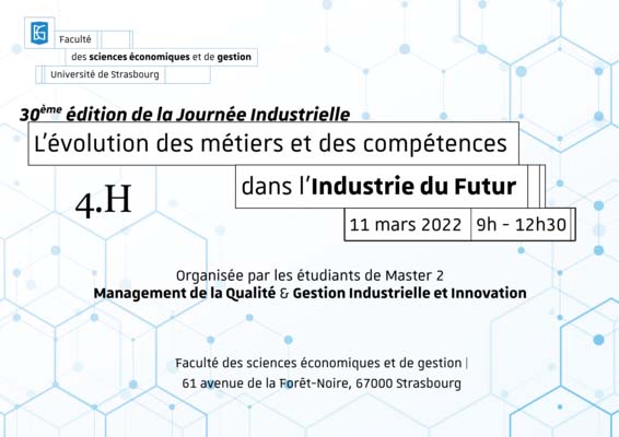 La 30ème édition de la Journée Industrielle intitulée « L'évolution des métiers et des compétences dans l’industrie du futur (4.0) » aura lieu le vendredi 11 mars 2022 à partir de 9h à la Faculté des sciences économiques et de gestion.