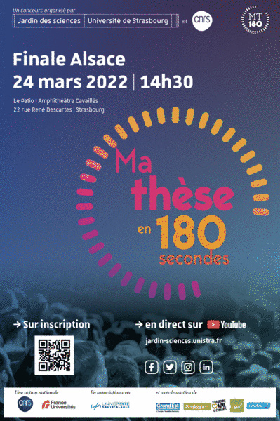 La finale régionale du concours Ma thèse en 180 secondes se déroule jeudi 24 mars 2022, à 14 h 30, en amphithéâtre Cavaillès (Patio).