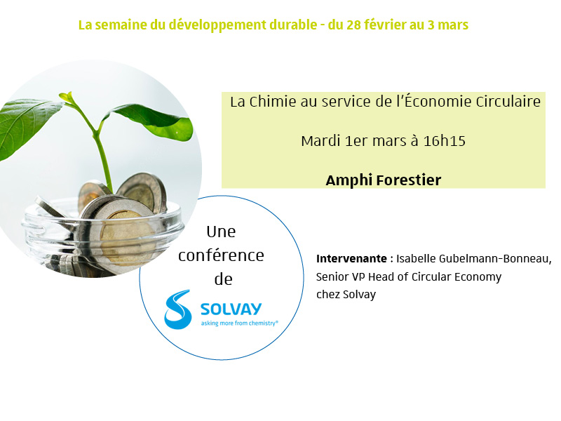 Une conférence de Solvay intitulée « La Chimie au service de l'Économie Circulaire » aura lieu le mardi 1er mars à 16h15 à l'École européenne de chimie, polymères et matériaux - Strasbourg (ECPM)