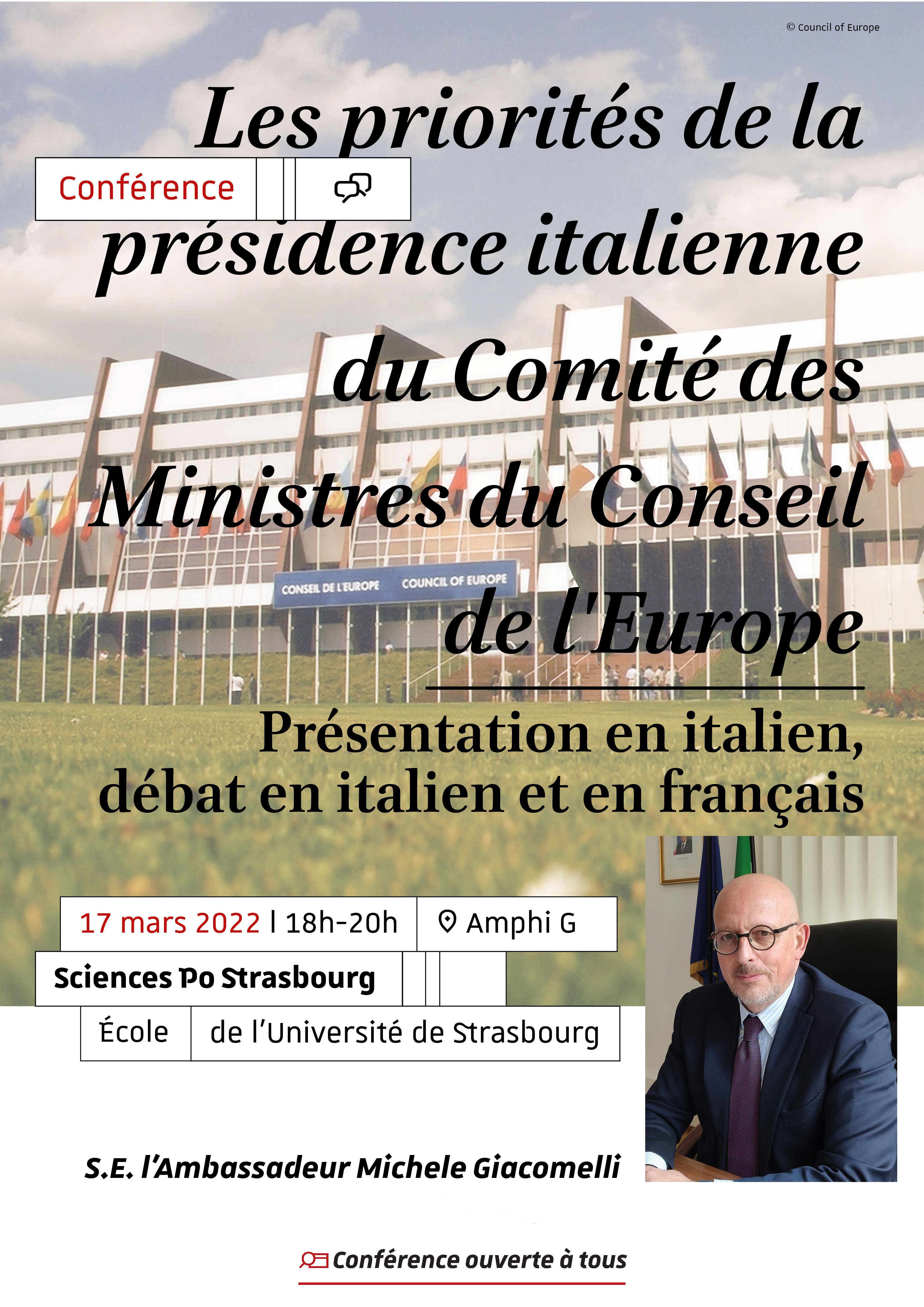 Une conférence intitulée « Les priorités de la présidence italienne du Comité des Ministres du Conseil de l'Europe » aura lieu le jeudi 17 mars à 18h au Cardo dans l'enceinte de l'Hôpital civil de Strasbourg.