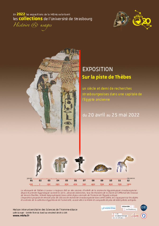 La nécropole de Thèbes à Louxor a toujours été un des centres d’intérêt de la recherche égyptologique strasbourgeoise : depuis le premier égyptologue nommé en 1872, Johannes Dümichen, tous les titulaires de la chaire ont effectué des travaux de terrain (fouilles, relevés épigraphiques) dans cette région centrale de l’histoire de l’Égypte antique. L’exposition propose de retracer plus de 150 ans de recherche strasbourgeoise dans cette vallée, en s’appuyant sur les objets et archives de la collection égyptienne de l’université, conservée à la MISHA et composée de plus de 6000 pièces antiques.