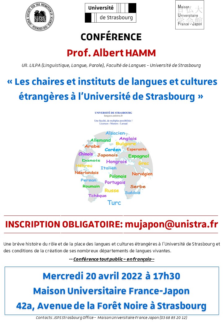 Une conférence intitulée « Les chaires et instituts de langues et cultures étrangères à l'Université de Strasbourg » aura lieu le mercredi 20 avril à 17h30 à la Maison Universitaire France-Japon. Elle sera animée par le Prof. Albert Hammur. LILPA (LInguistique, Langue, Parole), Faculté de Langues - Université de Strasbourg.