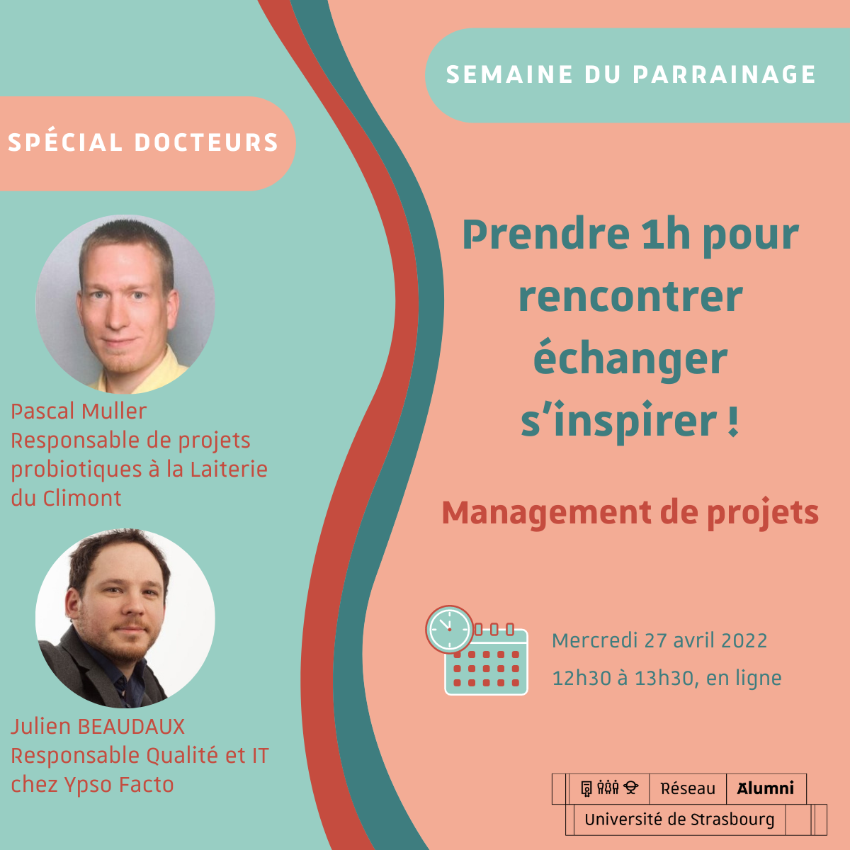 Dans le cadre de la Semaine du Parrainage spécial docteurs une rencontre autour du Management de projets aura lieu le mercredi 27 avril à 12h30 en ligne.