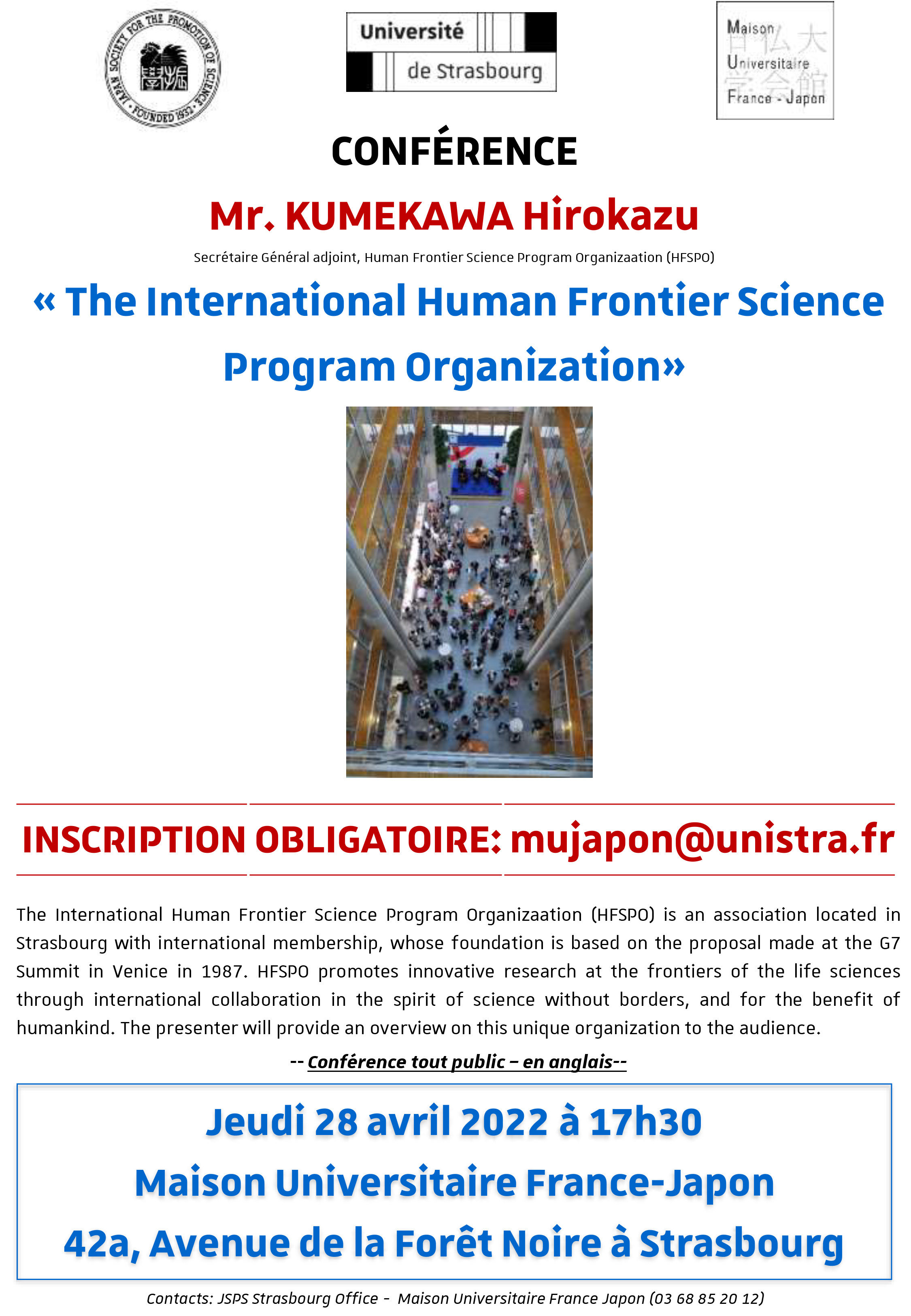 Une conférence intitulée « The International Human Frontier Science Program Organization » aura lieu le jeudi 28 avril à la Maison France-Japon.