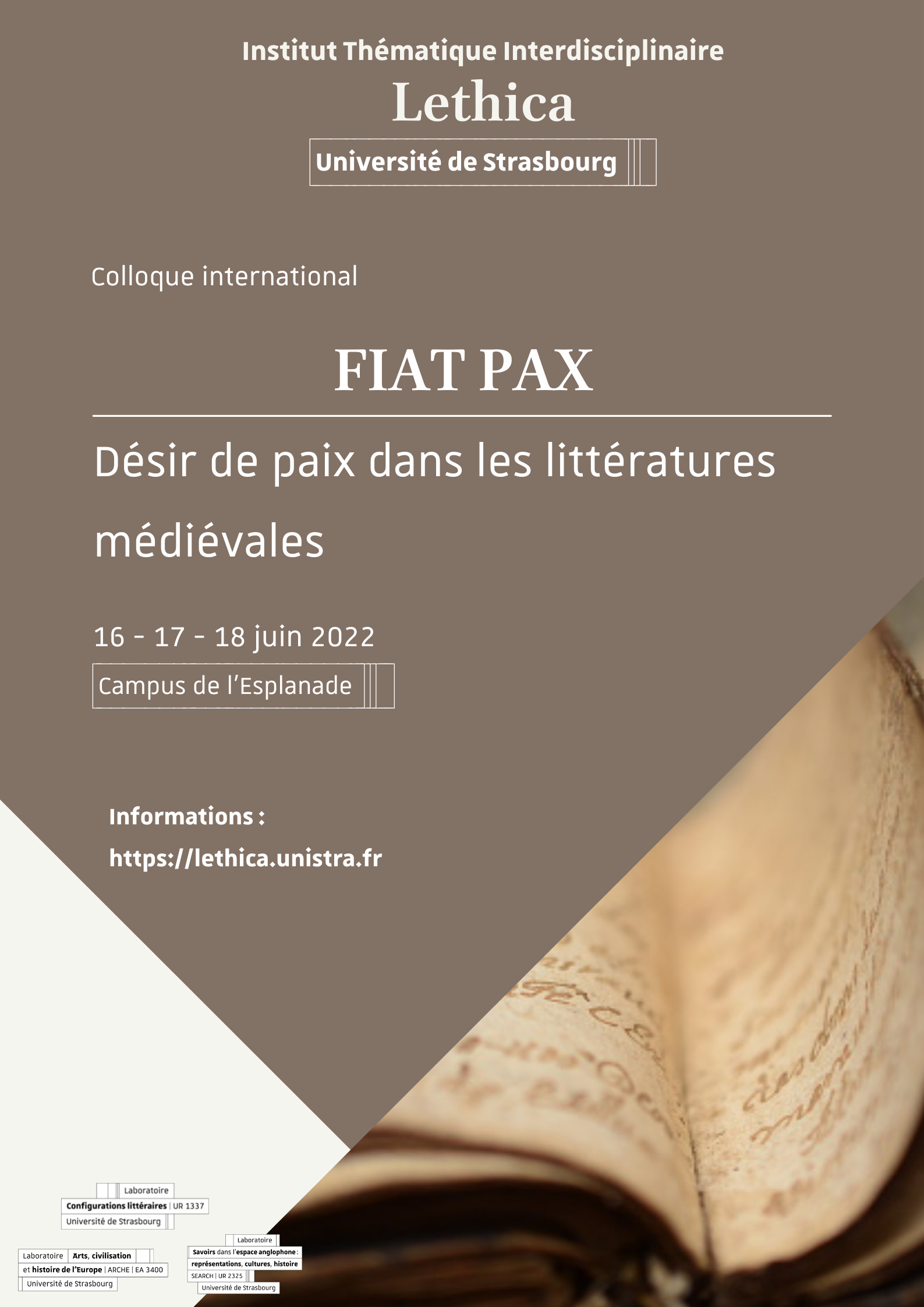 Un colloque intitulée « Fiat pax – désir de paix dans les littératures médiévales » aura lieu du jeudi 16 au samedi 18 juin à 14h.