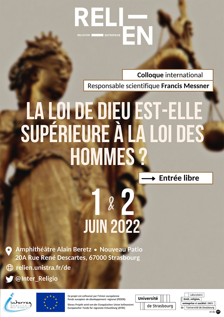 Le projet « RELIEN: Entreprise et Religion » co-financé par le Programme Interreg Rhin Supérieur etporté par Francis Messner, Responsable scientifique du projet RELIEN, directeur de recherche émérite au CNRS et professeur conventionné à l'Université de Strasbourg a le plaisir de vous inviter au colloque international intitulé « La loi de Dieu est-elle supérieure à la loi des hommes » ?. L’objectif de cette manifestation scientifique sera de déterminer de quelle manière les religions et plus particulièrement la religion musulmane, mettent en œuvre leur système normatif en France et cela dans une perspective comparative en retenant les religions catholique, protestante et juive. Une attention toute particulière sera portée aux résolutions et solutions dégagées par les autorités religieuses lors de frictions ou d’éventuelles collisions entre le droit étatique et les droits religieux. Cette investigation permettra de mesurer les différences et les convergences se dégageant entre les différentes religions et de préciser quelles sont les limites fixées par le droit national et le droit international.