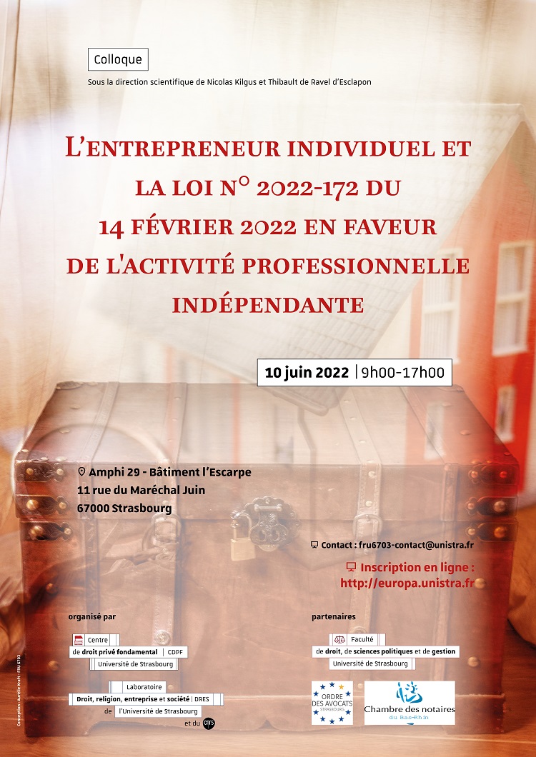 Un colloque intitulé « L'entrepreneur individuel et la loi n°2022-172 du 14 février 2022 en faveur de l'activité professionnelle indépendante » aura lieu le vendredi 10 juin à 9h à l'Escarpe sur le campus de l'Esplanade de Strasbourg.