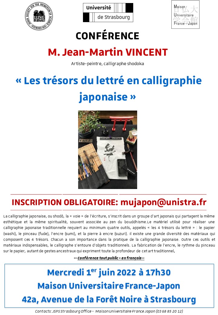 Une conférence intitulé « Les trésors du lettré en calligraphie japonaise » aura lieu le mercredi 1er juin à 17h30 à la Maison France-Japon avec la participation de M.Jean-Martin Vincent Artiste-peintre et calligraphe shodoka.