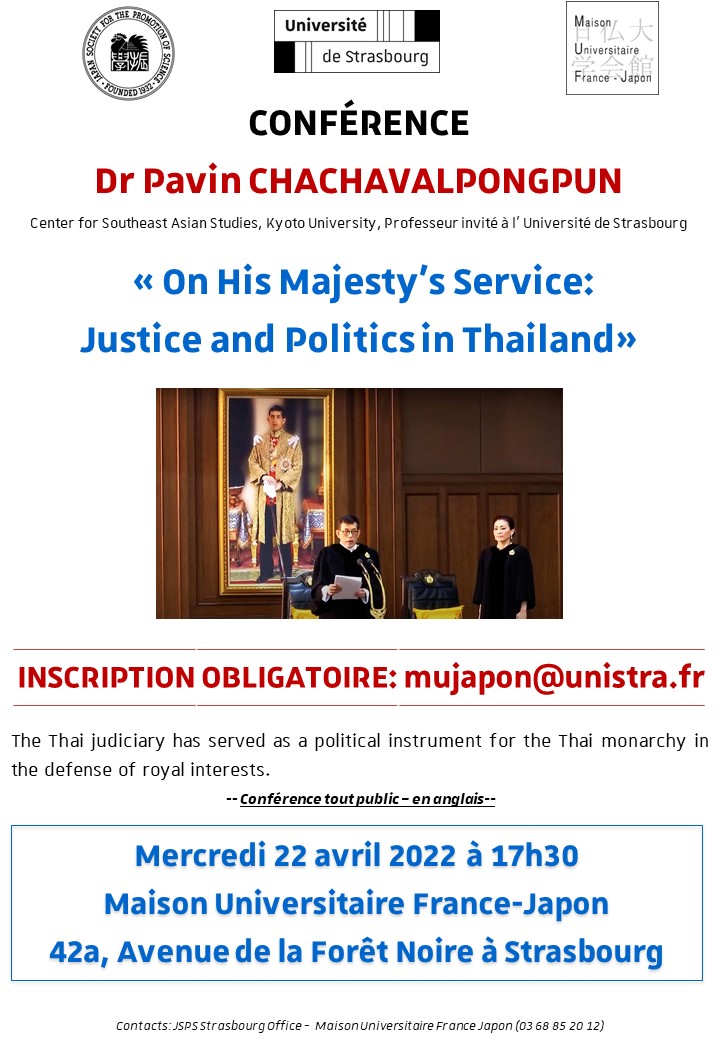 Une conférence intitulée « On His Majesty’s Service : Justice and Politics in Thailand » aura lieu le mercredi 22 juin à 17h30 à la Maison France Japon avec la participation du Prof. Pavin CHACHAVALPONGPUN, Center for Southeast Asian Studies, Kyoto University, Professeur invité à l’ Université de Strasbourg.