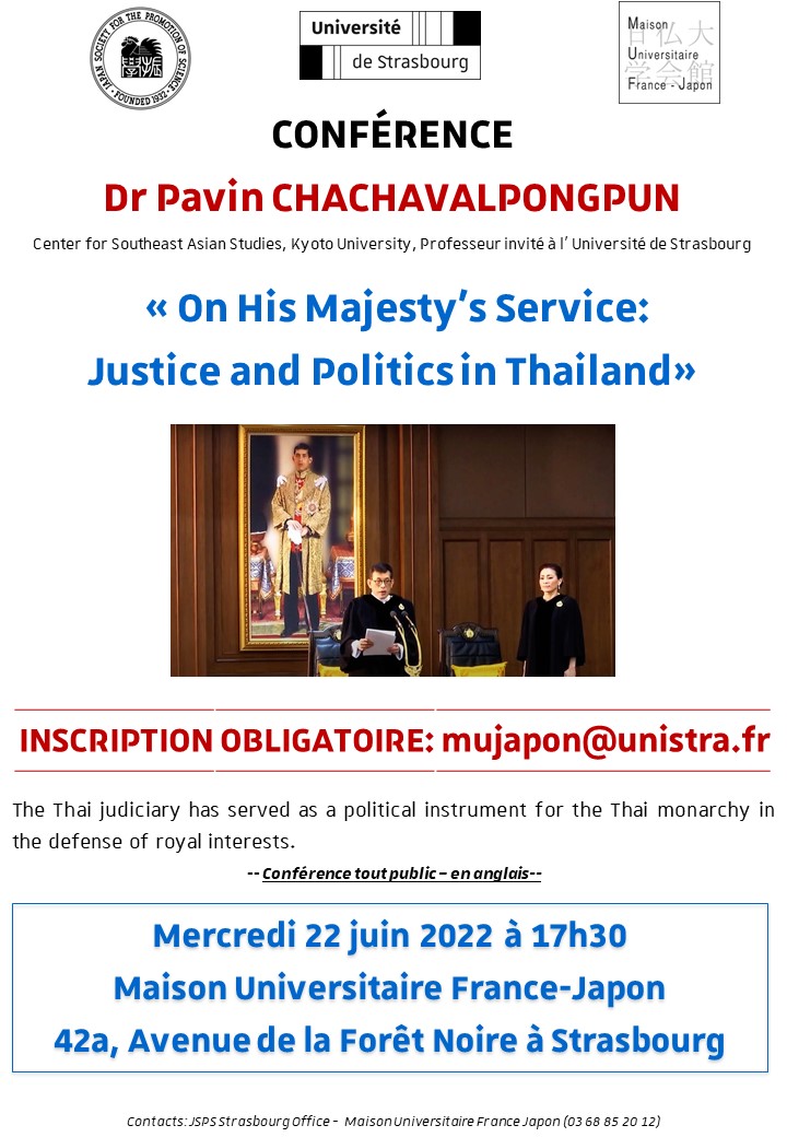 Une conférence intitulée « On His Majesty’s Service: Justice and Politics in Thailand » aura lieu le mercredi 22 juin à 17h30 à la Maison France Japon.