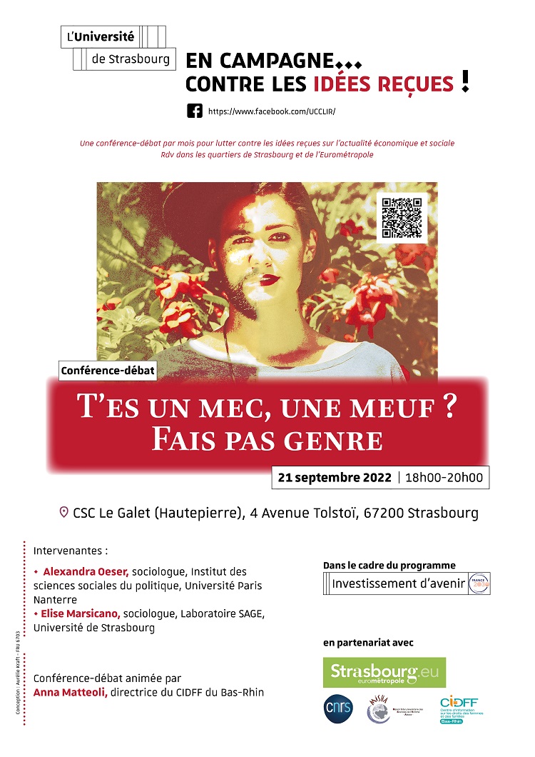 A l'occasion de la 3ème édition « L'Université en campagne contre les idées reçues » une conférence et un débat intitulé « T'es un mec ? T'es une meuf ? Fais pas genre ! » aura lieu le mercredi 21 septembre à 20h au Centre socio-culturel de Hautepierre le Galet.