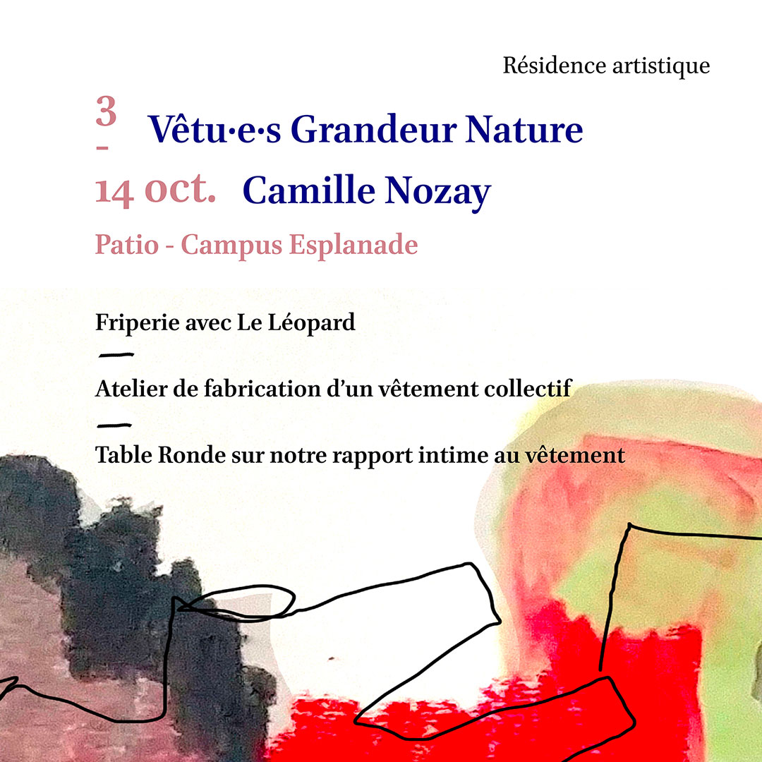 Du 3 au 14 octobre 2022, la résidence artistique de Camille Nozay (design textile, arts plastiques) rhabille l'université des thèmes chers à la créatrice : écologie textile et collectif.