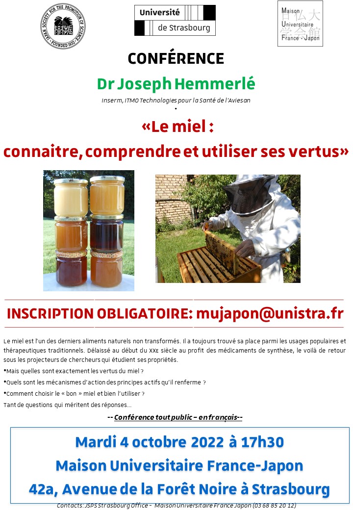 Une conférence intitulée « Le miel : connaitre, comprendre et utiliser ses vertus » du Dr Joseph Hemmerlé, Inserm, ITMO Technologies pour la Santé de l’Aviesan aura lieu le mardi 4 octobre à 17h30 à la Maison France-Japon.