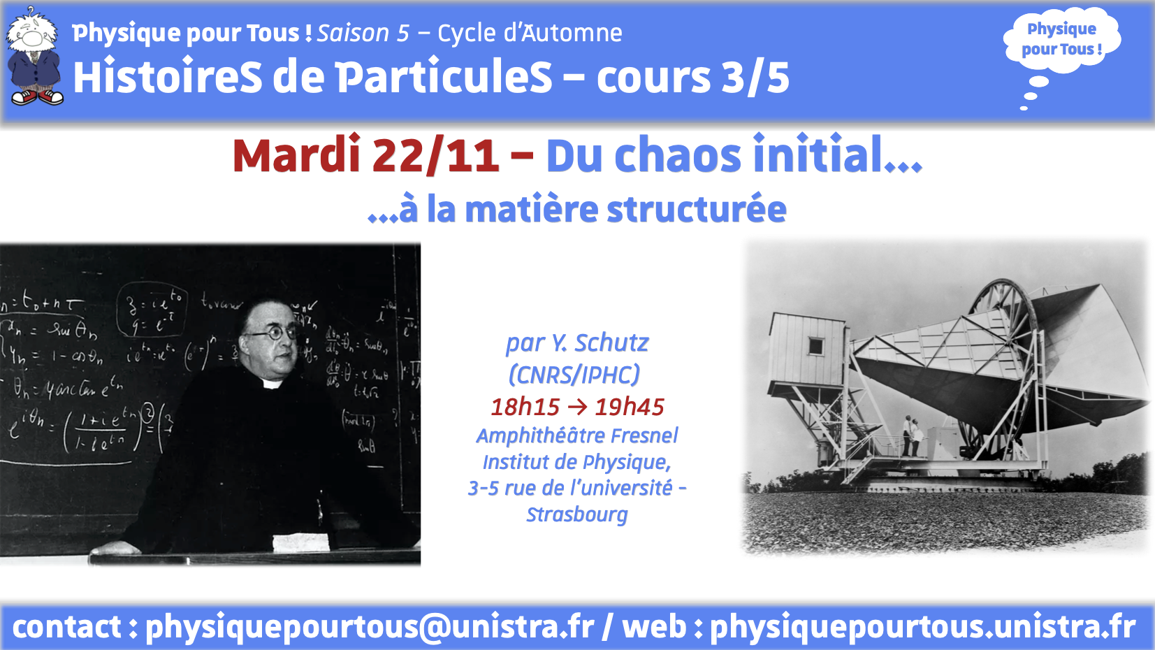 Dans le cadre du Cycle d'Automne de "Physique pour Tous !, une conférence intitulée « HistoireS de ParticuleS », Cours 3/5 “Du chaos initial…à la matière structurée” aura lieu le mardi 22 novembre 2022 à 18h15 à la Faculté de Physique & Ingénierie.