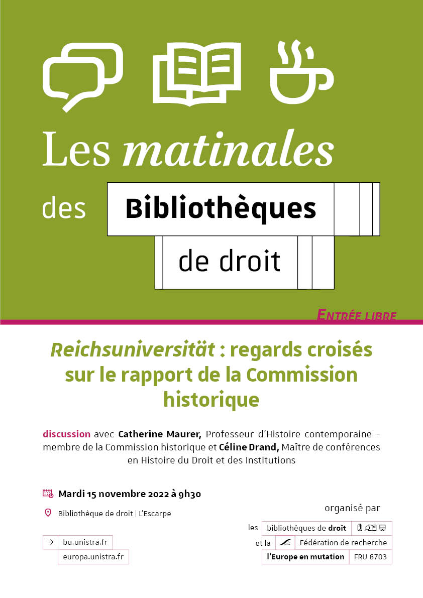 La Fédération de recherche L'Europe en mutation et les bibliothèques de droit organisent une Matinale des bibliothèques sur le thème : "Reichsuniversität : regards croisés sur le rapport de la Commission historique", discussion avec Catherine Maurer (membre de la commission et professeur d'histoire contemporaine) et Céline Drand (maître de conférences en histoire du droit et des institutions), à la bibliothèque de droit de L’Escarpe, mardi 15 novembre 2022, à 9 h 30.
