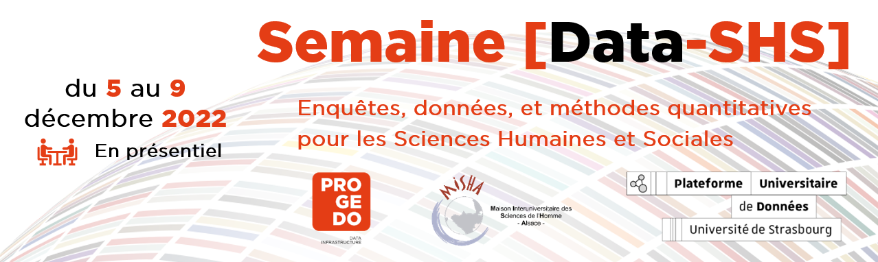La Plateforme Universitaire des Données (PUD-S) organise sa 4e édition de la semaine [Data-SHS] qui se tiendra du lundi 5 décembre au vendredi 9 décembre 2022 à la Maison Interuniversitaire des Sciences de l’Homme Alsace (MISHA). Cette semaine sera ponctuée de communications et d’ateliers en lien avec l’utilisation de données quantitatives en Sciences Humaines et Sociales. Ces interventions seront l’occasion d’évoquer les modes de collectes et besoins d’anonymisation des données d’enquêtes. Mais également l’utilisation de données confidentielles et la question de la reproductibilité des travaux de recherche. Des présentations plus spécifiques de données quantitatives, du catalogue de l’INED à celles sur le vieillissement viendront compléter cette offre.