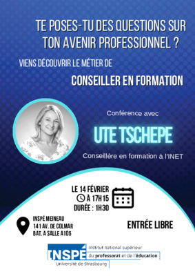 Une conférence intitulée « Conseillère en formation » aura lieu mardi 14 février de 17h à 19h. Cette conférence métier permettra à Madame Ute Tschepe, conseillère en formation à l'INET, de partager son parcours professionnel et son expérience.
