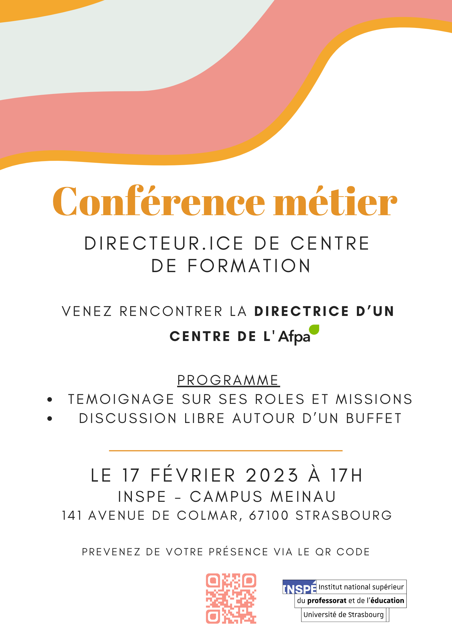 Le vendredi 17 février à 17h a lieu une conférence invitant la directrice du centre de l'AFPA de Mulhouse - Agence Nationale pour la Formation Professionnelle des Adultes - durant laquelle elle partagera son parcours et son activité actuelle. Puis, un temps d'échange autour d'un buffet est prévu afin de prolonger la découverte du métier et les réflexions autour.
