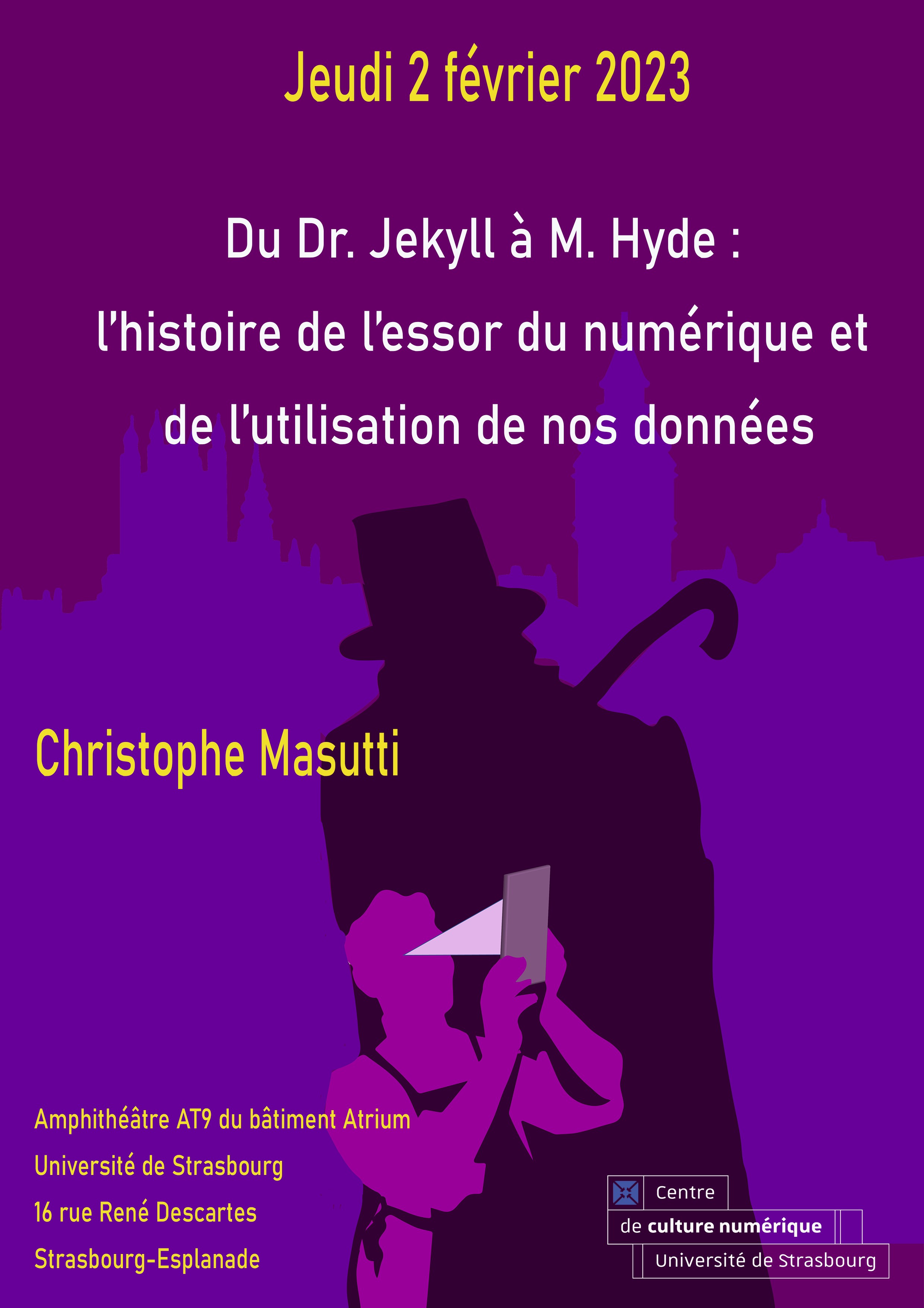 Une conférence intitulée « Du Dr. Jekyll à M. Hyde : une histoire de l’essor du numérique à travers l’utilisation de nos données » aura lieu jeudi 2 février 2023 de 18h à 20h à l'Atrium.