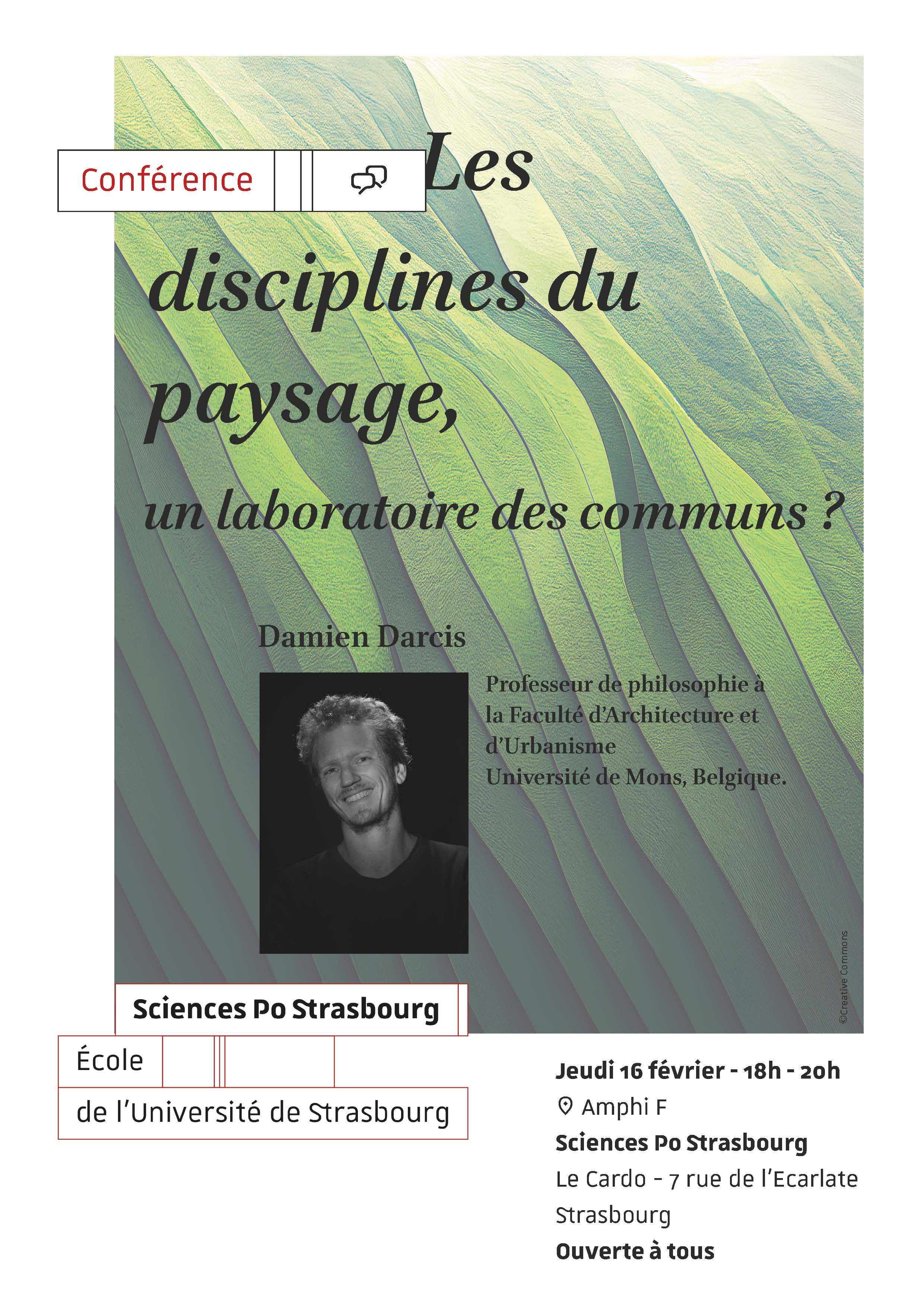 Sciences Po Strasbourg lance un cycle de conférences sur la thématique de l'environnement. Retrouvez le jeudi 16 février de 18h à 20h dans l'amphi F une conférence sur "Les disciplines du paysage, un laboratoire des communs ?" présentée par Damien Darcis, professeur de philosophie à la Faculté d'Architecture et d'Urbanisme à l'Université de Mons en Belgique.