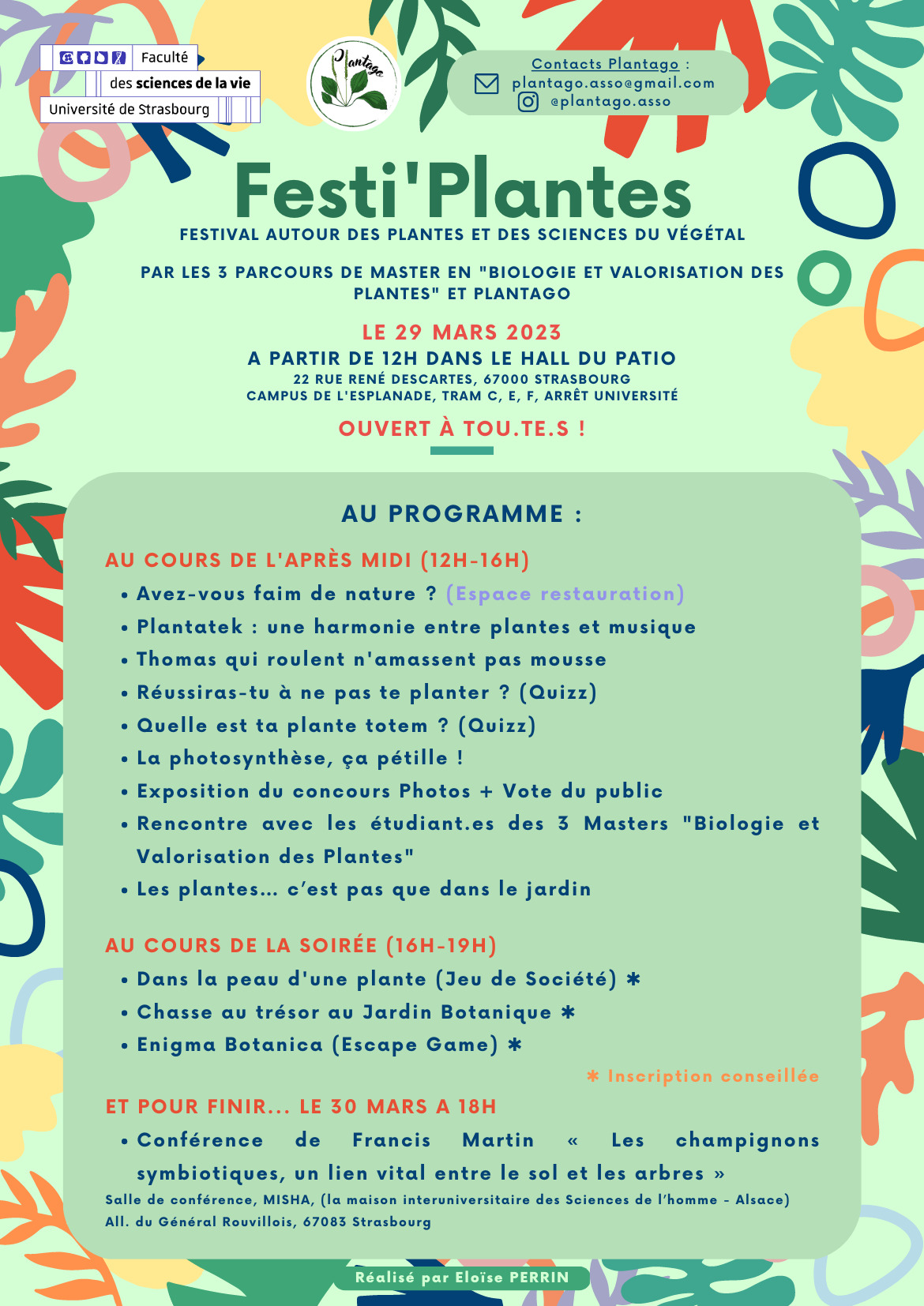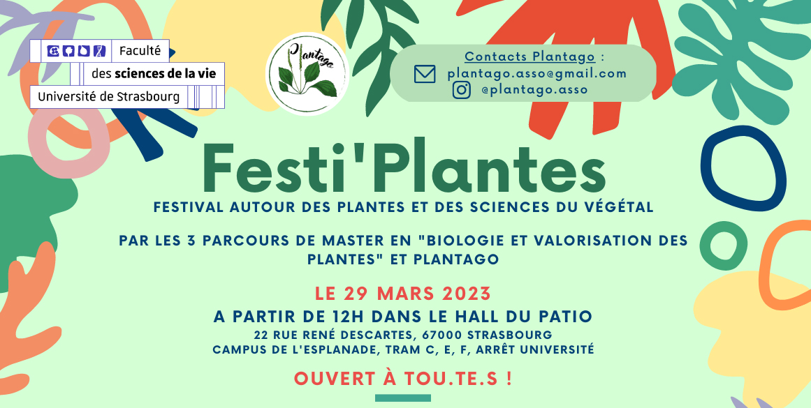 Les étudiants des trois parcours de master dans le domaine des plantes de l’université de Strasbourg et l’association Plantago vous invitent à découvrir de façon ludique de nombreux aspects du monde végétal lors du Festi’Plantes. Cet événement se tiendra dans le hall du Patio le mercredi 29 mars de 12 à 14h : plusieurs stands y seront présentés de même que les meilleures photos du concours organisé à cette occasion. D’autres activités seront organisées en fin de journée.