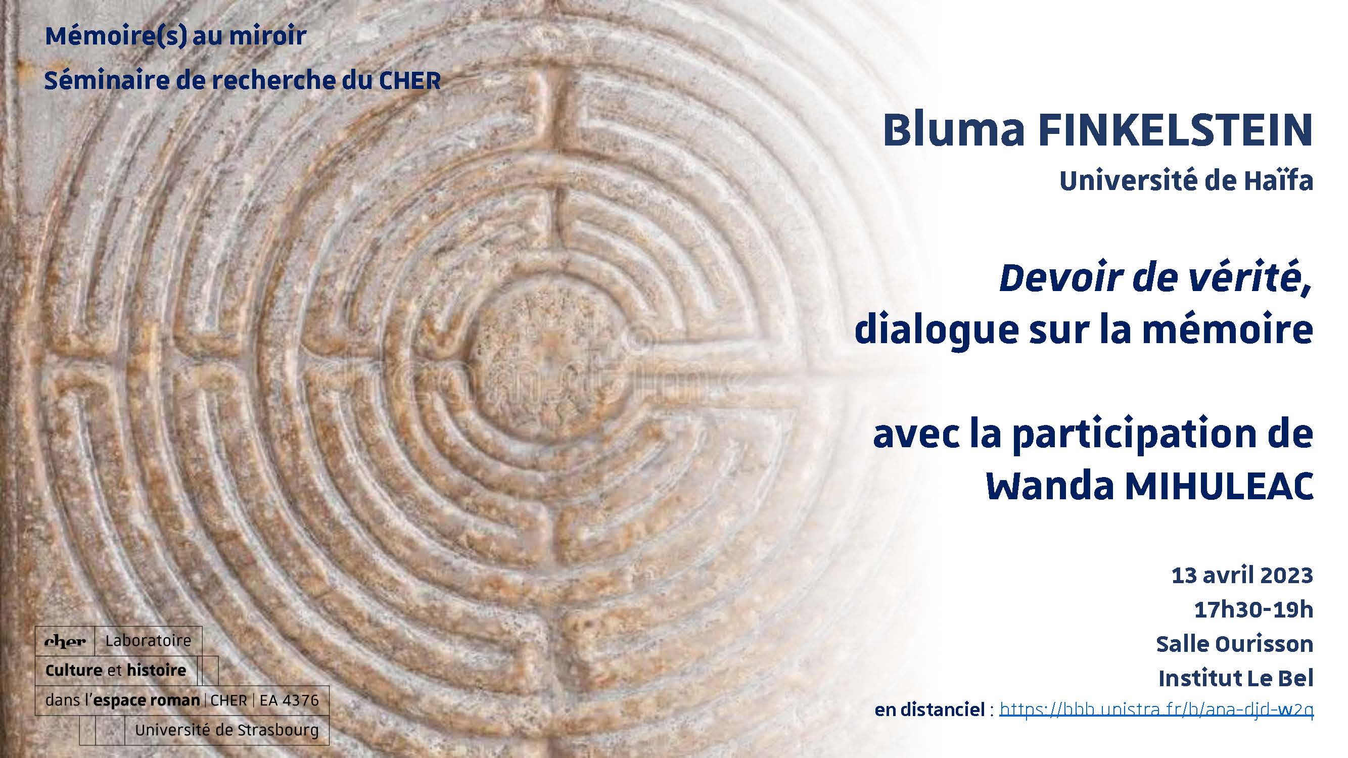 Pour la quatrième séance du séminaire « Mémoire(s) en miroir » , consacré à la mémoire et à ses représentations, le CHER accueille Bluma Finkelstein, professeur émérite de l’Université de Haïfa, qui donnera une conférence à partir de son roman « Devoir de vérité » (TranSignum, 2020) avec la participation de l’artiste plasticienne Wanda Mihuleac qui a conçu et édité l’ouvrage sous forme de livre-objet.