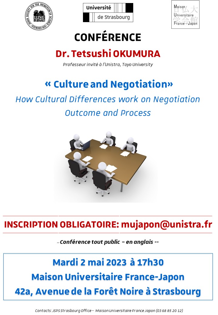 La Maison Universitaire France-Japon, en collaboration avec The Japan Society for the Promotion of Science (JSPS), a le plaisir de vous convier à la conférence intitulée « Culture and Negotiation - How Cultural Differences work on Negotiation Outcome and Proces » qui aura lieu mardi 2 mai à 17h30 à la Maison France Japon avec la participation du Dr. Tetsushi Okumura, Professeur invité à l’Unistra, Toyo University