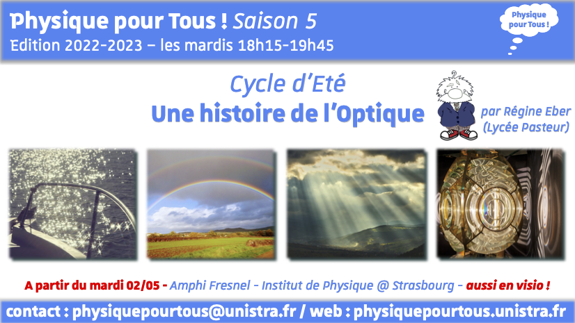 Cycle d'Eté «Une histoire des idées en Optique", proposé par Régine Eber (Lycée Pasteur de Strasbourg & Maison pour la Science en Alsace) à partir du mardi 2 mai 2023 pour 4 cours (1 cours par semaine).