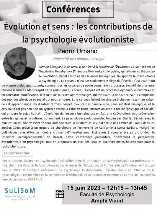 Une conférence intitulée « Évolution et sens : les contributions de la psychologie évolutionniste » aura lieu lundi 12 juin à 12h45 à la Faculté de psychologie. Elle sera animée par Pedro Urbano, université de Coimbra, Portugal.