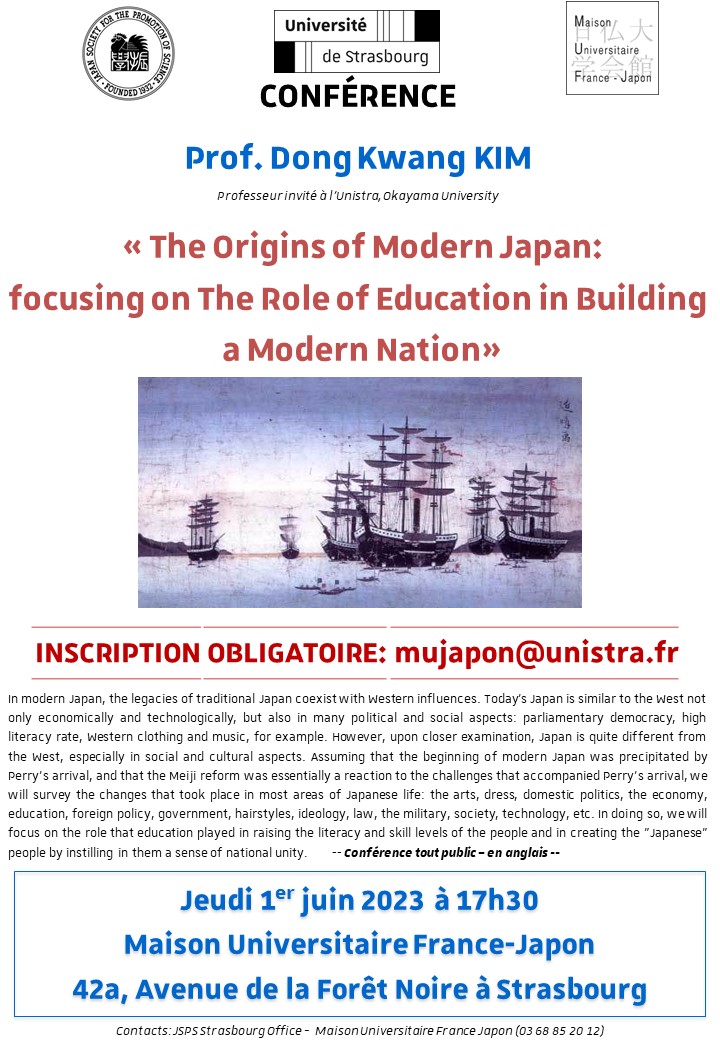 La Maison Universitaire France-Japon, en collaboration avec The Japan Society for the Promotion of Science (JSPS), a le plaisir de vous convier à la conférence intitulée « The Origins of Modern Japan: focusing on The Role of Education in Building a Modern Nation » jeudi 1er juin à 17h30. Elle sera assurée par le Prof. Dong Kwang KIM, Professeur invité à l’Unistra, Okayama University
