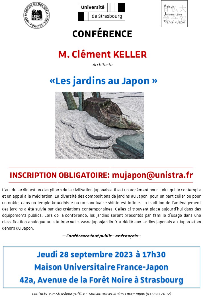 Jeudi 28 septembre 2023 à 17h30 Maison Universitaire France-Japon 42a, Avenue de la Forêt Noire à Strasbourg Résumé: L’art du jardin est un des piliers de la civilisation japonaise. Il est un agrément pour celui qui le contemple et un appui à la méditation. La diversité des compositions de jardins au Japon, pour un particulier ou pour un noble, dans un temple bouddhiste ou un sanctuaire shinto est infinie. La tradition de l’aménagement des jardins a été suivie par des créations contemporaines. Celles-ci trouvent place aujourd’hui dans des équipements publics. Lors de la conférence, les jardins seront présentés par famille d’usage dans une classification analogue au site internet « www.japonjardin.fr » dédié aux jardins japonais au Japon et en dehors du Japon.