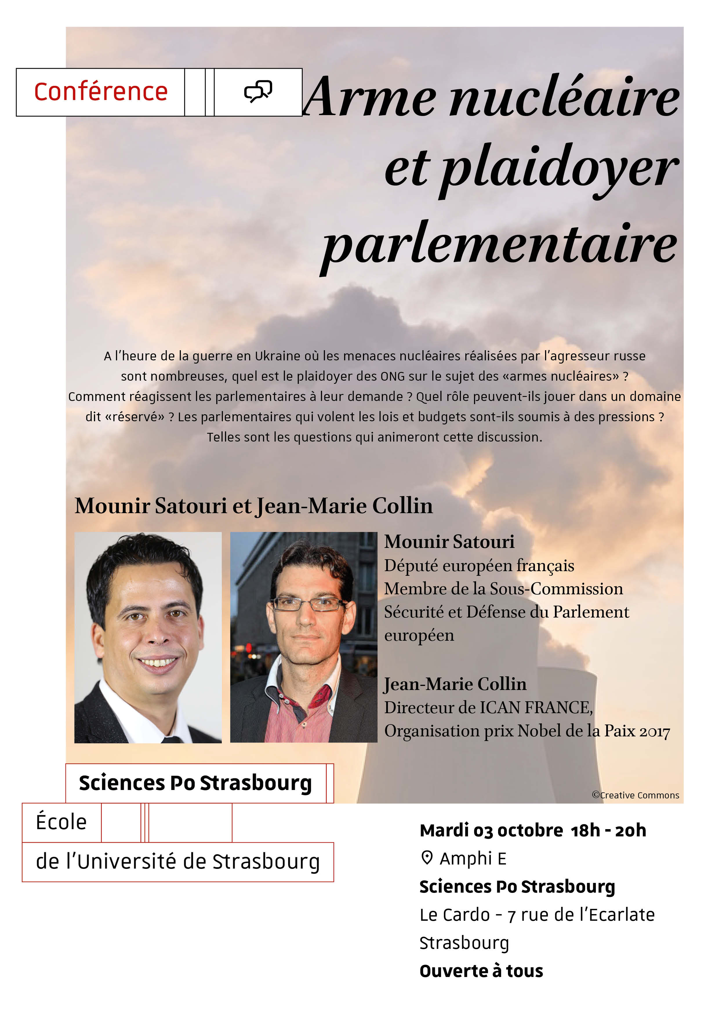 Telles sont les questions qui animeront cette discussion autour de M. Mounir Satouri, député européen français, membre de la Sous-commission Sécurité et Défense du Parlement européen et de M. Jean-Marie Collin, Directeur de ICAN France (organisation prix Nobel de la Paix 2017) et intervenant au sein de l’IEP Strasbourg.