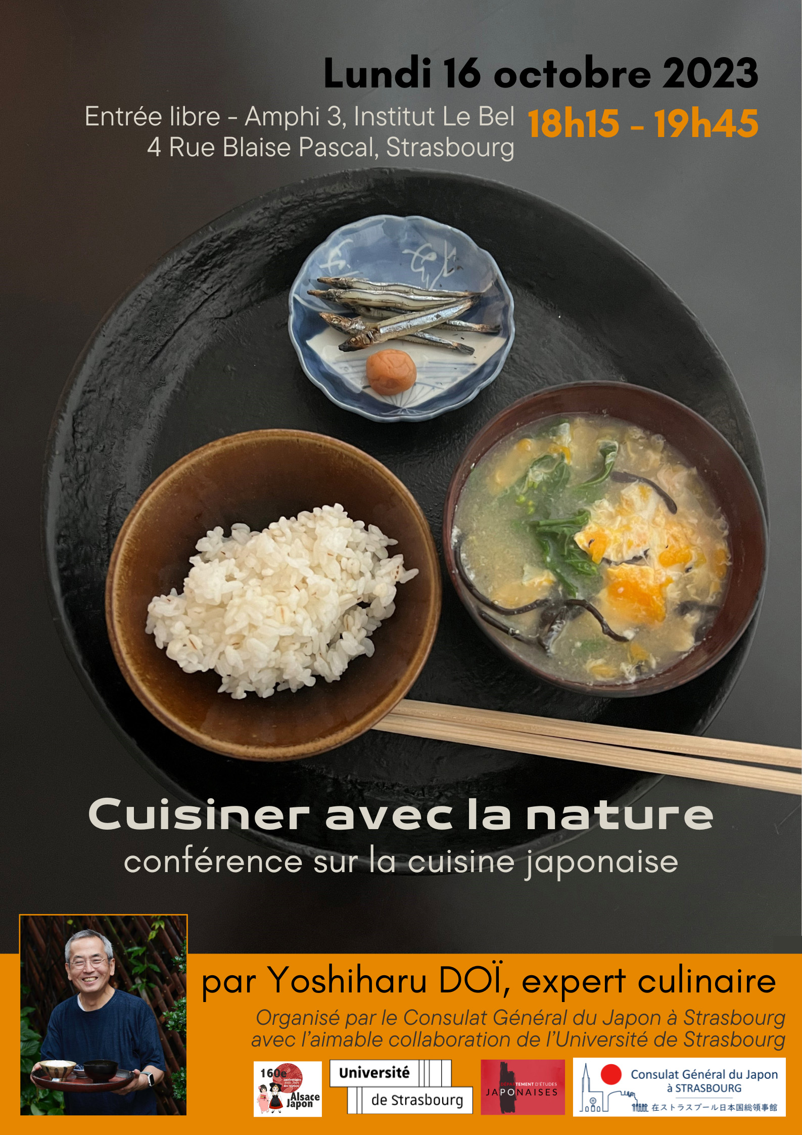 Une conférence intitulée « Cuisiner avec la nature, une réponse au dérèglement climatique pour les cuisiniers du futur ? » aura lieu lundi 16 octobre à 18h15 à l'Insitut Le Blaise sur le campus de l'Esplanade. Un expert culinaire japonais sera exceptionnellement à Strasbourg pour une conférence sur la cuisine « washoku ».