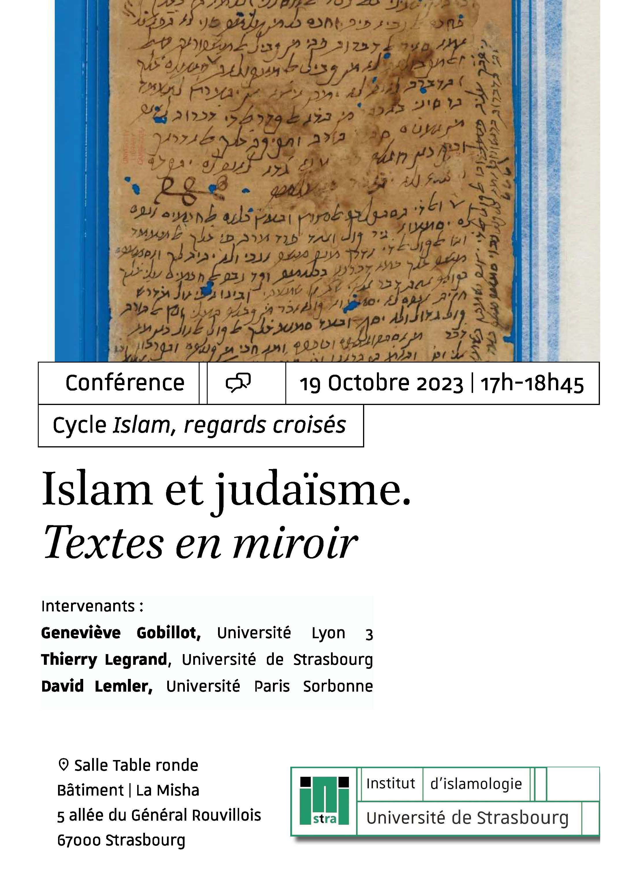 Dans le cadre du cycle des conférences Islam - regards croisés, une conférence intitulée « Islam et judaïsme : Textes en miroir » aura lieu jeudi 19 octobre à 17h à la Maison interuniversitaire des sciences de l'Homme - Alsace (Misha).
