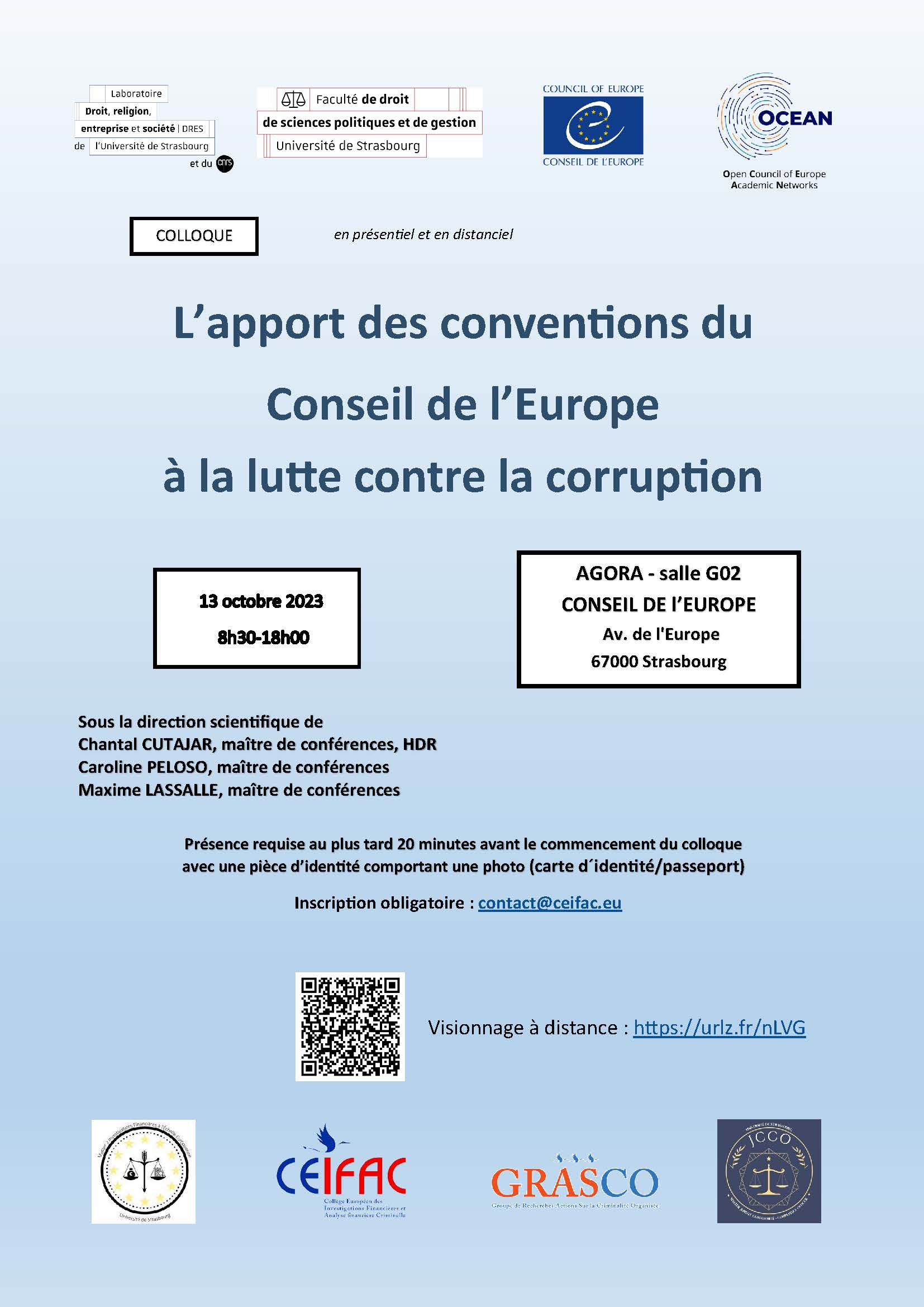 Le réseau français sur les conventions du Conseil de l’Europe en matière de corruption est animé par Madame Chantal CUTAJAR, maître de conférences, habilitée à diriger les recherches à la Faculté de droit de Strasbourg, directrice du Master Investigations financière à l’échelle européenne et du Master Juriste conformité – compliance officer, directrice générale du CEIFAC de l’Université de Strasbourg, responsable du GRASCO (Équipe de recherche en droit des affaires de l’UMR DRES), directrice de la Revue du GRASCO, Directrice générale du CEIFAC (Collège européen des investigations financières).