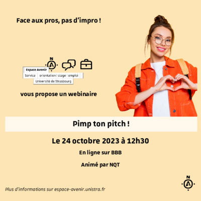 Un webinaire intitulé « Pimp ton pitch ! Les secrets d'une présentation efficace et professionnelle » aura lieu mardi 24 octobre à 12h30.