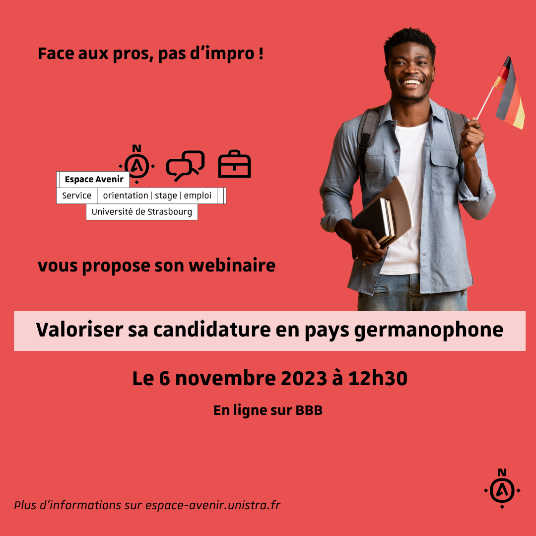 Un webinaire intitulé « Valoriser sa candidature dans un pays germanophone » aura lieu lundi 6 novemvre à 12h30.