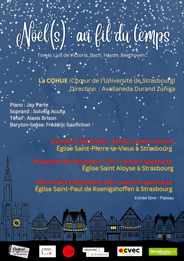 Un concert donné par « La Cohue », choeur de l'université de Strasbourg sur le thème de « Noël(s) : au fil du temps » aura lieu mercredi 13 décembre à 20h à l'Église St-Paul de Koenigshoffen.