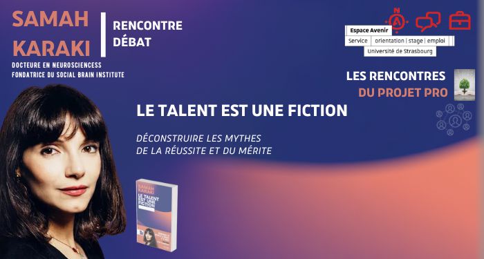 1ère conférence du cycle des rencontres du projet pro autour de questions d’orientation et d’insertion professionnelle, intitulée « "Le talent est une fiction » qui aura lieu mardi 5 décembre à 14h au nouveau Patio sur le campus de l'Esplanade de Strasbourg.